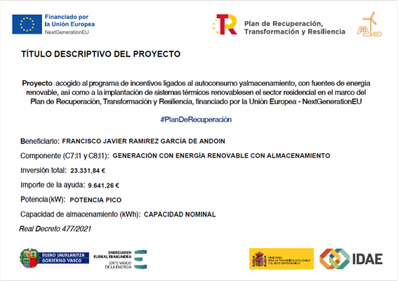 "Este proyecto está acogido al programa de incentivos ligados al autoconsumo y almacenamiento, con fuentes de energía renovable, así como a la implantación de sistemas térmicos renovables en el sector residencial en el marco del Plan de Recuperación, Transformación y Resiliencia, financiado por la Unión Europea – NextGenerationEU."
